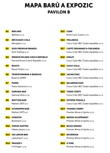 Prague Bar Show se rozprostírá ve všech čtyřech Křižíkových pavilonech i ve venkovní zóně s food courtem. Na více než 7 000 m² zde najdete expozice vystavovatelů, bary, stage i doprovodný program.
